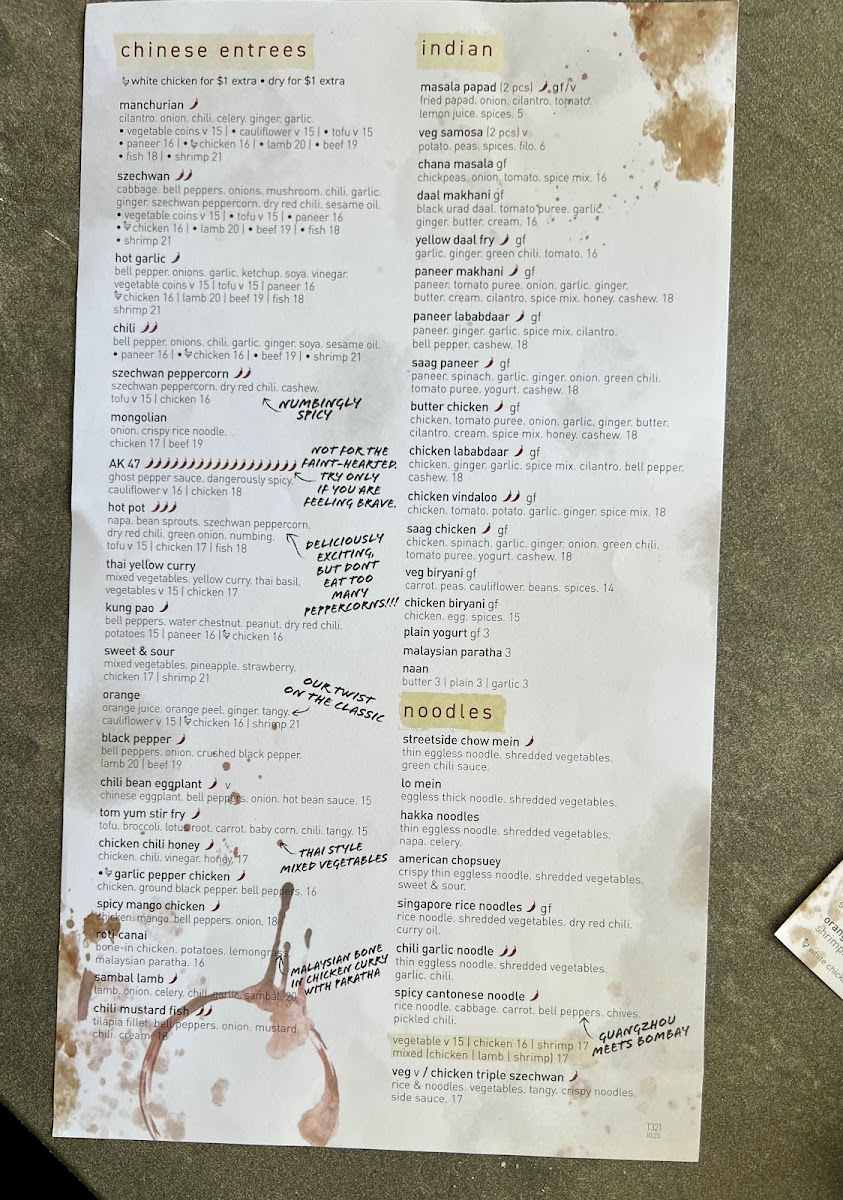 Very spicy. Choose Veg (vegan), or Chicken. Rice, noodles, vegetables, tangy, crispy noodles, side sauce.