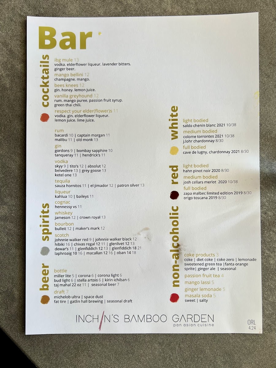 Inchin's Bamboo Garden Orlando Menu